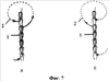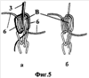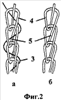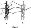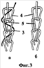 На фиг.7 стрелками показано направление прокладывания нити для получения ниточной петли и место закрепления ее в структуре шнура против часовой стрелки (фиг.7, а), по часовой стрелке (фиг.7, б).
