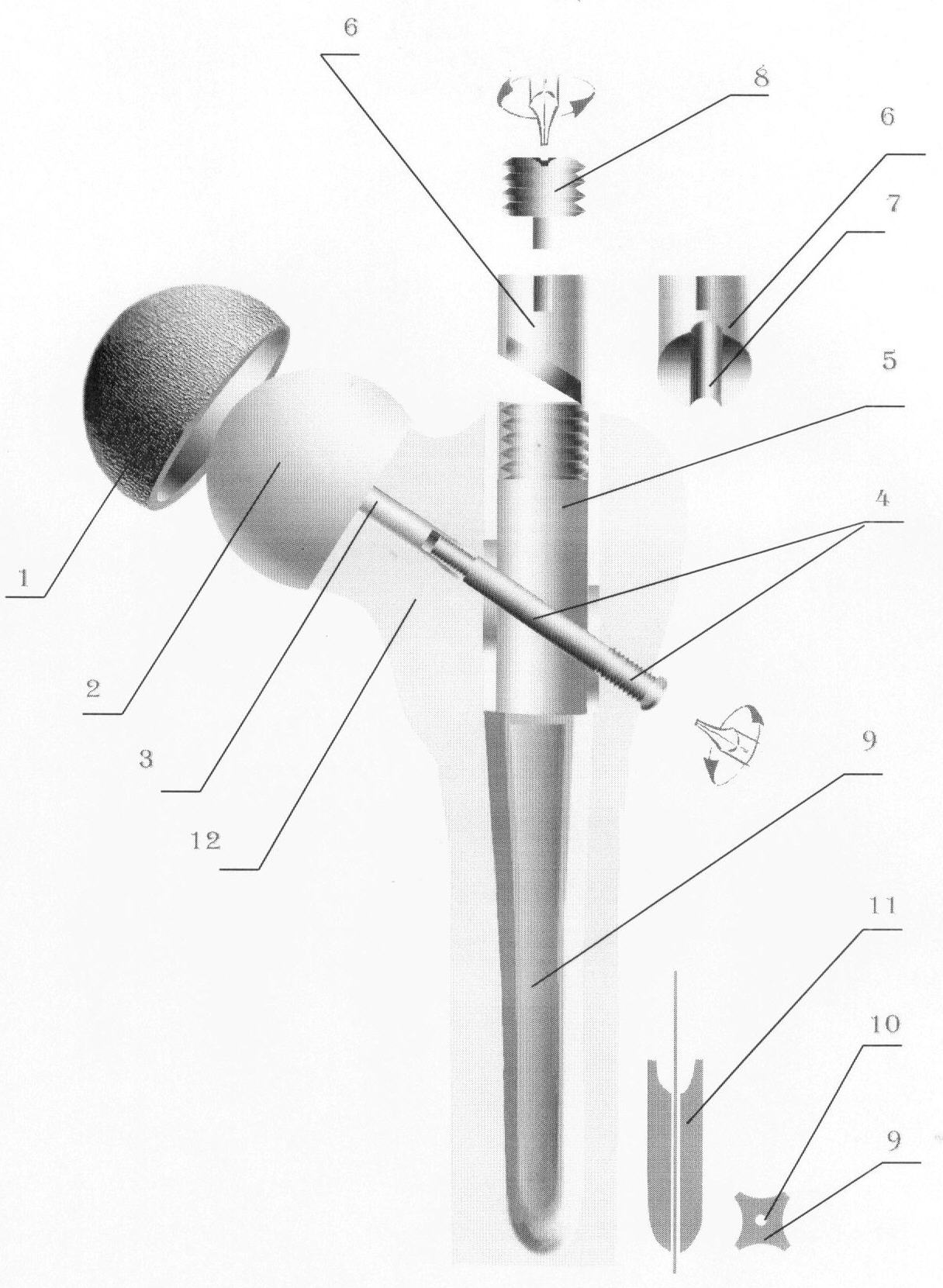 Сначала заднее-боковым доступом длиной 15 см в проекции большого вертела послойно подходят к тазобедренному суставу, крестообразно рассекают капсулу и входят в полость сустава. Вывихивают головку из суставной впадины. Готовят поверхность дна вертлужной впадины под вертлужный компонент эндопротеза с помощью сферических фрез. Устанавливают вертлужный компонент 1 (фиг.1). Затем начинают этап замены бедренного компонента. Для чего вводят спицу Киршнера на 4 см ниже большого вертела по оси шейки бедренной кости 12 через полюс головки. Глубину введения спицы и правильность выбранного направления контролируют рентгенологически, затем канюлированным сверлом делают отверстие под имплантат через всю шейку и головку бедренной кости. Длину канала определяют с помощью линейки со щупом. Со стороны головки бедра устанавливают цилиндрическую фрезу, внутренний диаметр которой соответствует внутреннему диаметру сферического компонента протеза. Удаляют боковую поверхность в виде кольца с головки бедра, опиливают сферический полюс головки перпендикулярно оси шейки. Вставляют сферический компонент 2 протеза направляющей втулкой 3 в канал-отверстие в шейке бедра 12 и легкими ударами молотка через пластмассовый наконечник насаживают сферическую часть протеза на культю головки. С помощью сверла и дрели высверливают отверстие, которое начинается над большим вертелом и продолжается в естественный костномозговой канал. Вводят проксимальный интрамедуллярный штифт 5 в костномозговой канал до тех пор, пока наружный блокирующий винт 4 не попадет в косое отверстие штифта 5. После введения блокирующего винта 8 вворачивают его в отверстие втулки сферического компонента головки протеза и затягивают до упора отверткой 11. Имплантат 9 имеет четырехугольную форму с внутренним отверстием 10. В отверстие верхней части штифта вставляют цилиндрический усеченный наконечник 6 таким образом, чтобы его закругленная, усеченная часть 7 уперлась в боковую поверхность блокирующего винта, и прижимают его специальным внутренним винтом 8 до упора.