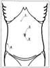 Предлагаемый нами способ иллюстрирован на чертеже, где 1 – брюшная стенка, 2 – пупочное кольцо, 3 – умбиликальный разрез, 4 – подвздошный разрез.