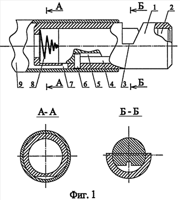 Конструктивно мундштук (фиг.1) состоит из открытого в донной части цилиндрического стакана (1) и перемещаемого в нем поршня (2). Стакан (1) с переднего конца сверху имеет поперечную усеченную клиновидную прорезь (3), образованную тремя плоскостями, одна из которых перпендикулярна продольной оси стакана, другая имеет наклон к этой оси, образуя скос, направленный к концу мундштука, а третья параллельна оси. Поршень (2) снизу в передней своей части имеет лыску, образующую выпускной канал (4). В нем же устроен направляющий паз (5), а в стакане (1) установлен соответствующий штифт (6), препятствующий вращению и выпадению поршня (2) из стакана. Стакан (1) в своей задней части имеет снизу наружную лыску, служащую перепускным каналом (7) для подвода содержимого из подающей трубки (9) к выпускному каналу (4) поршня (2). На дне стакана установлена запирающая пружина (8), выдвигающая поршень в переднее положение, разъединяющее перепускной канал (7) стакана и выпускной канал (4) мундштука. Поршень (2), так же как и стакан (1), сверху своего переднего конца имеет поперечную усеченную клиновидную прорезь (10), образованную также тремя плоскостями, одна из которых перпендикулярна продольной оси поршня, другая имеет обратный по сравнению с прорезью в стакане наклон к этой оси, также образуя скос, но направленный к началу мундштука, а третья – параллельна этой оси (фиг.2). Прорези в стакане и поршне совместны, а их оппозитные скосы пересекаются.