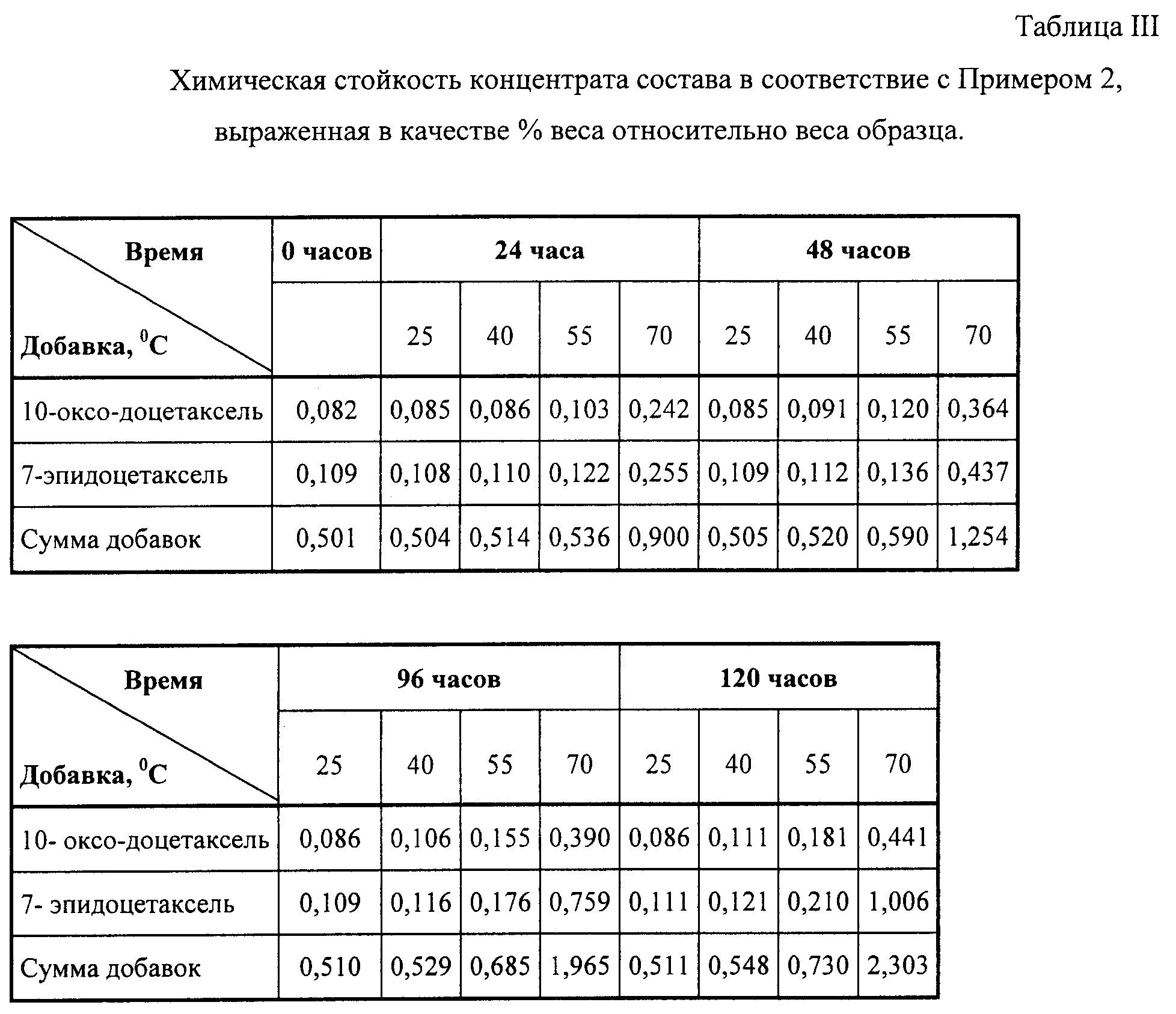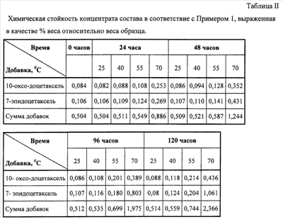 Недавно было обнаружено, что концентрат, содержащий доцетаксель, растворенный в полисорбате 80, и этанол с добавкой цитратного буфера или любого другого физиологически приемлемого буфера, демонстрирует удивительно высокую химическую и физическую стойкость. Определенную стойкость в течение последних нескольких лет не описывали в сходных лекарственных препаратах до сегодняшнего дня. Во время параллельного тестирования в диапазоне времени от 6 до 12 дней, химическая стойкость концентрата, содержащего доцетаксель, превысила в десять -пятнадцать раз химическую стойкость коммерчески доступного препарата Таксотер® («Авентис Фарма» (Aventis-Pharrna)). Высокая стойкость подтвердилась также для предварительно приготовленной смеси, полученной с помощью раствора концентрата с вспомогательным растворителем (со-растворителем). Концентрат можно долго хранить в пределах срока хранения для коммерческих целей, и даже после длительного периода хранения, добавки со-растворителя (вспомогательного растворителя) и обычного разбавления медицинским персоналом он формирует стабильный инфузионный раствор.