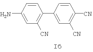 Пример 2. Получение 4-амино-2,3′,4′-трицианодифенила. К смеси 5.94 г цинковой пыли, 2.86 г ледяной уксусной кислоты, 1.70 г воды, 20 мл изопропилового спирта и 10 мл ацетона при перемешивании добавляют 1.82 г 4-нитро-2,3′,4′-трицианодифенила (СОВ 92%) и выдерживают 25 ч при кипячении с обратным холодильником. Горячую массу фильтруют через бумажный фильтр, остаток на фильтре промывают кипящим изопропиловым спиртом (3×50 мл). Из объединенного фильтрата удаляют растворитель на ротационном испарителе, остаток переносят на тканевый фильтр и последовательно промывают 0.1 М водным раствором поташа, затем водой до pH 6, сушат на воздухе до постоянного веса. Продукт из остатка (4.54 г) экстрагируют хлористым метиленом, после удаления которого из экстракта получают 1.08 г светло-желтых кристаллов, содержащих по данным ПМР 95% целевого амина с т.пл. 278-279°C (выход 67%). Возгонкой (240-260°C/10 мм рт.ст.) получают 4-амино-2,3′,4′-трицианодифенил, т.пл. 284-285°C. ИК-спектр, KBr, , см-1: 3468 и 3383 (NH2), 2228 (C N). Спектр ЯМР 1Н (400 МГц, (CD3)2CO , м.д.): 7.06 д.д (1H, Н5, JHH орто 8.6; JHH мета 2.5 Гц), 7.12 д (1Н, Н3, JHH мета 2.5 Гц), 7.44 д (1H, Н6, JHH орто 8.6 Гц), 8.07 д.д (1Н, Н6′ JHH орто 8.2; JHH мета 1.8 Гц), 8.16 д (1H, Н5′ JHH орто 8.2; JHH пара 0.5 Гц), 8.21 д (1H, Н2′ JHH мета 1.8; JHH пара 0.5 Гц), 5.81 с (2Н, NH2). ЯМР 13C (300 МГц) в DMCOd6: , м.д. 150.1 (С4), 143.6 (С1′), 134.1 (С5′), 133.4 (С6′), 133.3 (С2′), 131.5 (С1), 126.7 (С6), 118.6 (С5), 118.3 (С3), 117.5 и (С3′), 116.0 (C N), 115.8 (C N), 115.0 (C N), 112.7 (С4′), 110.5 (С2). Найдено: M+ 244.07517. C15H8N4. Вычислено: 244.07489. Найдено: С 73.21; Н 3.12; N 22.66. Вычислено: С 73.75; Н 3.31; N 22.94.