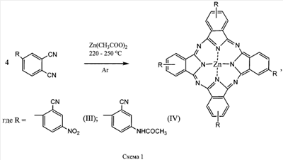 Применимость заявляемых соединений для синтеза фталоцианинов иллюстрируется получением фталоцианиновых комплексов цинка из 4-нитро-2,3′,4′-трицианодифенила и 4-ацетиламино-2,3′,4′-трицианодифенила, получаемого ацетилированием 4-амино-2,3′,4′-трицианодифенила, что является примером использования аминогруппы для модификации соединения с целью придания ему свойств, необходимых для применения в качестве «строительного блока» при сборке фталоцианинового остова. Тетра-(2-циано-4-нитрофенил)фталоцианин цинка и тетра-(2-циано-4-ацетиламино)фталоцианин цинка получены в реакциях 4-нитро-2,3′,4′-трицианодифенила и 4-ацетиламино-2,3′,4′-трициандифенила, соответственно, с ацетатом цинка по схеме 1.