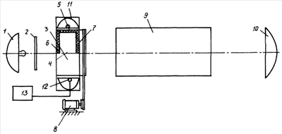 Принцип действия калейдоскопического проектора следующий. Луч света от источника света 1 проходит через матовое стекло 2, прозрачные основания 6 и 7 кассеты 3, цветной диаскопический материал 4 находящийся в кассете 3, затем через зеркальную систему 9, систему линз 10 образует на экране цветные узоры (экран на чертеже не показан). При вращении кассеты узоры на экране меняются.