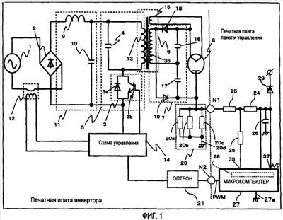Схема 14 управления инвертором формирует контур управления с отрицательной обратной связью для получения информации об уровне и форме сигнала тока инвертора от трансформатора 12 тока и получения данных об анодном токе магнетрона 8 от панели управления через соединитель N2 и развязывающий оптрон 21, и вычисляет отклонение. В схеме 14 управления инвертором используется генератор сигнала пилообразной формы, компаратор широтно-импульсной модуляции (ШИМ) или подобный для генерации ШИМ-сигнала для создания сигнала ШИМ и инициируется включение/выключение полупроводникового переключающего элемента 3. На этом заканчивается пояснение конфигурации, включающей в себя монтажную плату инвертора. Инвертор для выпрямления энергии переменного тока и преобразования ее в высокочастотную энергию состоит из схемы 2 мостового выпрямителя, сглаживающей схемы 11, инвертора 5 и схемы 14 управления инвертором, хотя конфигурация инвертора не ограничивается указанным вариантом воплощения.