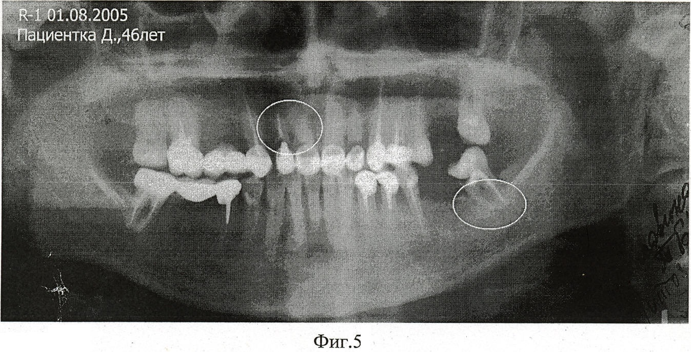 Рентгенографические обследования больной показали восстановление костной ткани вокруг корня 23 зуба через 3 месяца после инъекции (см. Фиг.3)и через 2,5 года, (см. Фиг.4).