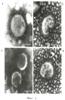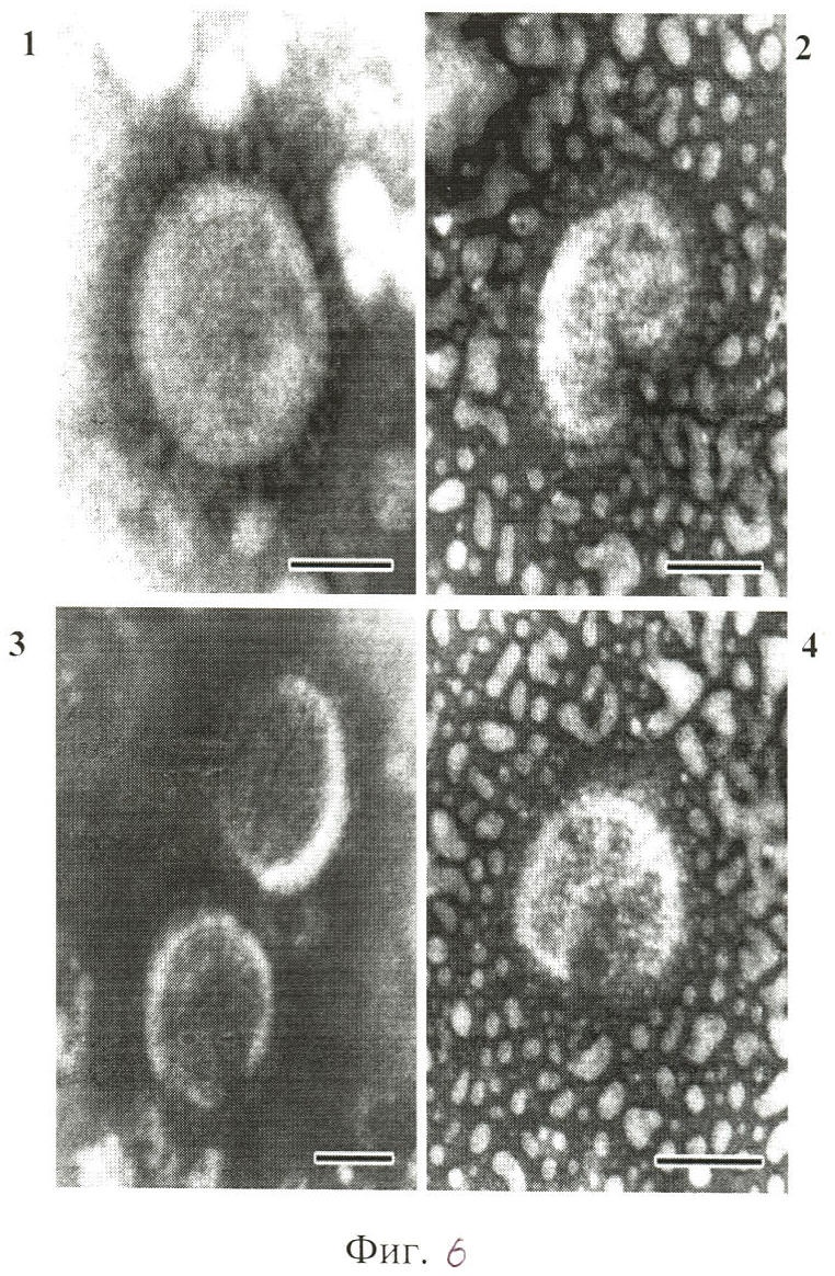 На фиг.6 представлены электронные микрофотографии частиц вируса гриппа, где на снимке 1 – интактный вирус (на поверхности сферической частицы видны пепломеры, оболочка не повреждена), на снимках 2-4 – вирус гриппа, обработанный искусственной рибонуклеазой в стандартных условиях (на поверхности частиц видны пепломеры, разрывы оболочки, частицы деформированы) Негативное контрастирование ФВК. Длина масштабной линии 50 нм.