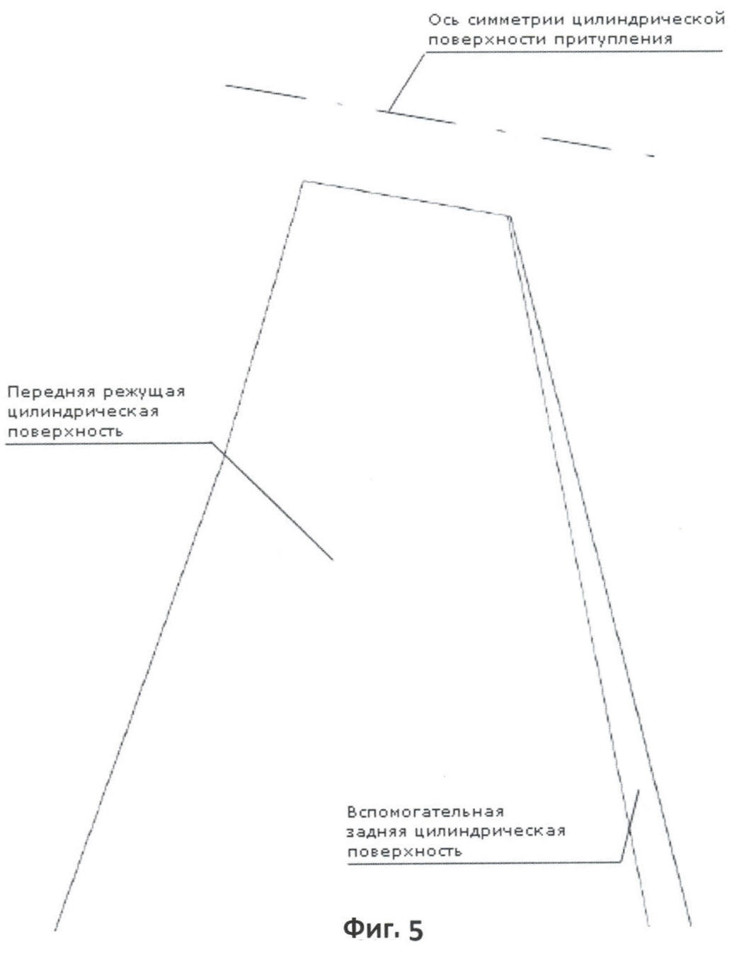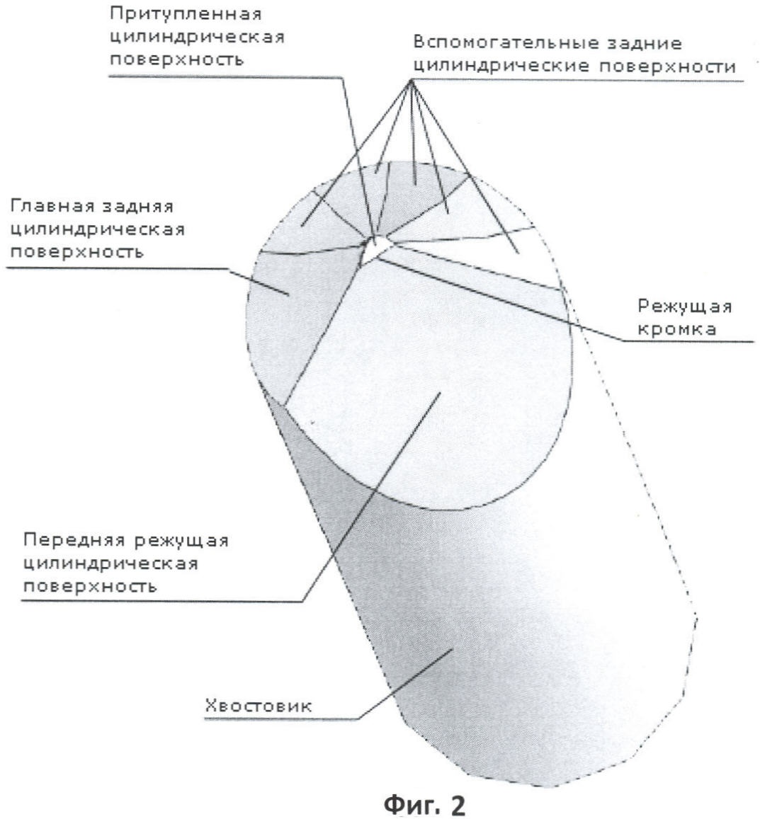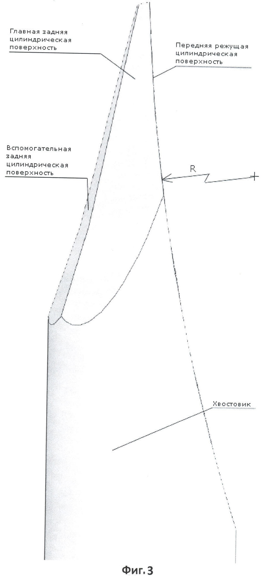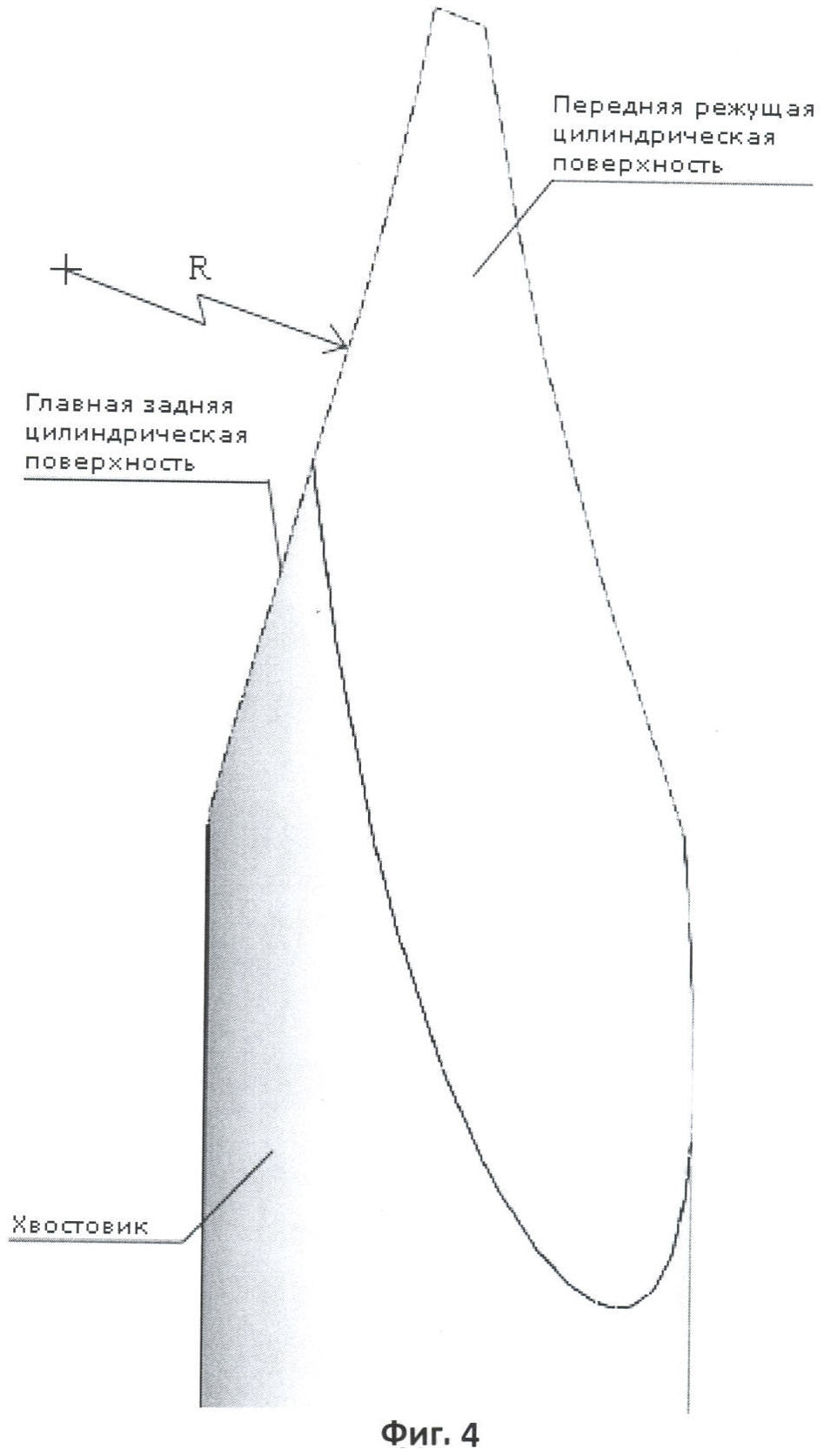 На фиг.3 изображен заявленный резец, ориентированный таким образом, что ось симметрии передней режущей цилиндрической поверхности перпендикулярна плоскости чертежа и, следовательно перпендикулярна оси хвостовика, которая находится в плоскости чертежа.