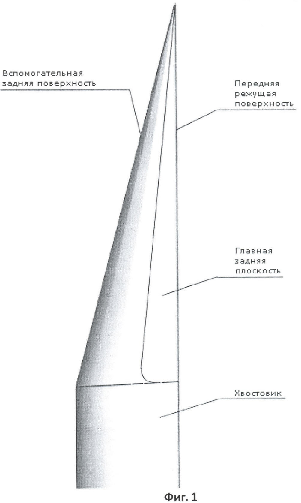 На фиг.1 изображен граверный резец известной конструкции (прототип). У него передняя режущая и главная задняя поверхности – плоские. Вспомогательная задняя поверхность – коническая. Поверхность притупления также плоская (на чертеже не показана).