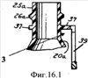 На Фиг.16 изображен кольцеобразный крючок по заявке ЕР 0764588 А1 и бутыль в разрезе, где показано «цельное» место крепления (37) кольцеобразного крючка к бутыли и которое не содержит в себе отверстие, а само отверстие (39) находится в стороне. Для наглядности на Фиг.16.1 изображен тот же кольцеобразный крючок, но уже специально направленный вниз, по подобию крючка по заявке 2007136807 RU, и в этом случае так же в месте (37) отсутствует отверстие для прохода с верхней стороны формообразующего элемента в место под креплением кольцеобразного крючка к бутыли (37) и между расширяющимся горлышком бутыли (20а).