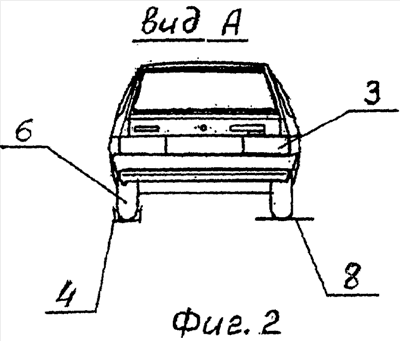 Автомобиль 3 движется по дороге 1 (фиг.1), при этом шины 5 (фиг.3) его переднего и заднего колес 6 (фиг.2) с одной стороны автомобиля 3 размещены в направляющем желобе 4 (фиг.2), который может быть выполнен в виде стального швеллера 7 (фиг.3). Колеса с другой стороны автомобиля 3 размещены на опорной стальной полосе 8 (фиг.1, 2), уложенной вдоль автомобильной дороги (чтобы не нарушать асфальтовое покрытие дороги).