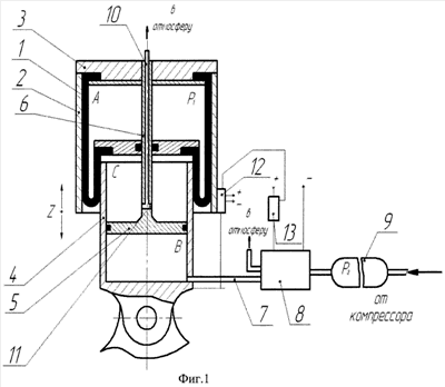 Верхняя полость «С» постоянно сообщается через осевое отверстие 10 и радиальные отверстия 11 в штоке 6 поршня 5 с атмосферой, при этом никакого сопротивления при протекании воздуха из полости «С» в атмосферу или обратно не создается.