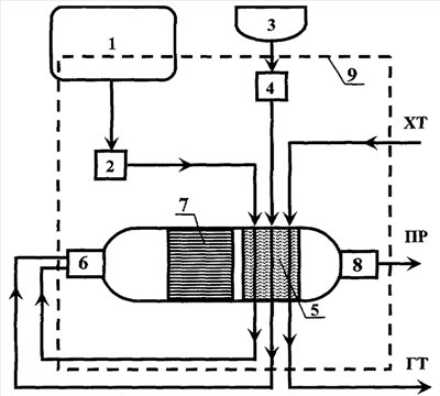 Для запуска ГТГ топливо из автомобильного бака или баллона 1 при помощи системы подачи и дозирования 2, включающей соответствующие устройства, через теплообменник 5 подают в систему запуска 6, снабженную при необходимости системой предварительного подогрева. Туда же с помощью системы подачи 3 и дозирования 4 воздуха через теплообменник 5 подают воздух в качестве окислителя. Смесь воздуха и топлива подают в соотношении, превышающем стехиометрическое значение для реакции полного окисления на 15-20%. Подготовленную смесь воспламеняют свечой системы запуска 6. Продуктами горения разогревают конвертор 7 генератора тепла и газа, удаляя продукты реакции горения через систему выпуска 9. По мере нагрева катализатора в конверторе реакцию переводят из режима пламенного горения в режим каталитической реакции. Горячие продукты реакции, проходя через теплообменник 5, производят нагрев холодного теплоносителя (XT). Горячий теплоноситель (ГТ) циркулируя через систему охлаждения двигателя и систему кондиционирования салона автомобиля производит предпусковой нагрев двигателя и нагрев салона транспортного средства. Необходимость в первоначальном воспламенении топливно-воздушной смеси пропадает, если для первоначального разогрева катализатора в конверторе ГТГ используют, например, электрический нагрев. Теплообменник 5, система запуска 6, конвертор 7 и система управления 9 могут быть выполнены как отдельные части ГТГ, так и быть интегрированы друг с другом.