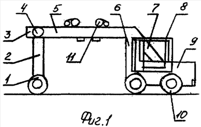 В качестве силового блока 9 может применятся автомобильный агрегат (двигатель с коробкой передач) и ведущий мост с управляемыми колесами 10. Кабина 8 автомобильного или тракторного типа. Желательно оборудование ее поворотным рабочим местом, облегчающим наблюдение за погрузкой и разгрузкой. Возможно применение среднего не поворотного моста.