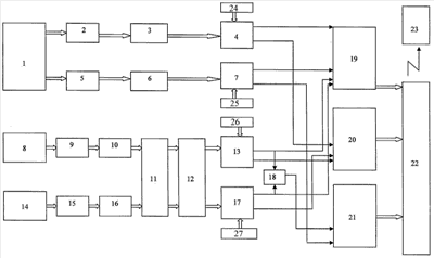 Общим для блоков являются анализаторы 19, 20, 21, передающее устройство 22 и приемник 23.