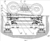 На фиг.5, 6 показан вид сбоку на установку разворота вагонных тележек в момент скатывания с нее вагонной тележки в одну или другую сторону, из этой фигуры видны механические системы, задействованные при этом.