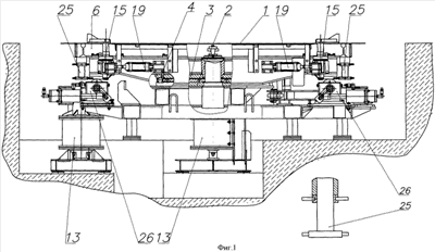 На фиг.1 представлена установка разворота тележек грузовых или пассажирских вагонов, вид сбоку. На данной фигуре показаны все основные механические системы данного оборудования, позволяющие в совокупности достигнуть поставленную цель предлагаемого технического решения.