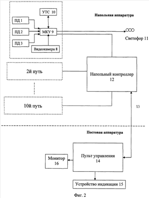 Устройство включает также видеокамеру 8, расположенную на электроприводе. Путевые датчики ПД1, ПД2, ПД3 и видеокамера 8 подключены к модулю 9 контроля управления (МКУ), один выход которого соединен с цепью 10 управления электроприводом тормозного упора (УТС), другой – со светофором 11, а третий выход соединен через напольный контроллер 12 посредством канала связи 13 с постовой аппаратурой, включающей пульт управления 14 дежурного по станции с блоком 15 индикации и монитором 16.