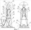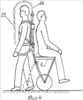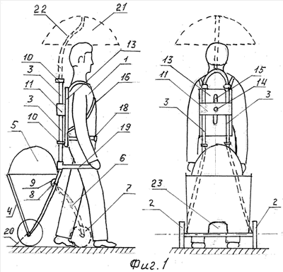 На фиг.1 изображен человек (1), перемещающий предлагаемое устройство, опорная колесная пара (2), к оси которой прикреплена трубчатая рама (3). К последней на осях вращения прикреплена откидная рама (4) с возможностью установки грузовой емкости (5) в образованном таким образом угловом пространстве. Кроме того, к боковинам рамы (3) шарнирным образом прикреплена пара опорных рычагов (6) с возможностью поворота вперед на один и тот же угол и фиксации в точках максимального поворота, причем каждый из этих рычагов оканчивается колесом (7) на оси вращения. Боковины рамы (3) состоят из шарнирно связанных частей с осями вращения (8), с упругими элементами (9). Боковины рамы (2) охватывает пара скользящих стопоров (10) с возможностью фиксации в определенных точках рамы. Боковины рамы (3) проходят сквозь цилиндрические отверстия связующего элемента (11), причем по всей их внутренней поверхности с частичным углублением в корпус выполнены свободно вращающиеся шарики (12), множество которых плотно охватывает трубчатые боковины рамы (см. ниже фиг.3). Связующий элемент (11) подвижным или фиксированым образом скреплен с пластиной (каркасом) (13) посредством осевого элемента (14), который выполнен с возможностью как вертикального перемещения по щелевым пазам (15), так и подпружиненного радиального смещения в пределах определенного угла относительно упомянутой пластины (каркаса) (в дальнейшем именуемой наспинным элементом). К последнему прикреплены наплечные лямки (16), а по другому варианту – пара наплечных дуг (17), см ниже фиг.3. Кроме того, с наспинным элементом (13) скреплен поясной ремень (18). Кроме того, в другом варианте комплектации к боковинам рамы (3) подвижным образом прикреплена пара рычагов (19), оканчивающихся рукоятками на концах, причем с возможностью фиксации этих рычагов в определенных точках боковин рамы (3). Рычаги (19), кроме функции передачи поддерживающего усилия на раму (3), наделены функцией передачи с рукояток (которыми оканчиваются данные рычаги) управляющих импульсов на тормозное устройство для колес, смонтированное на опорной оси (2). Тормозное устройство на чертеже не обозначено. Данное тормозное устройство (например, велосипедная тормозная втулка), имеет также функцию устранения вращения колес (2) в обратную от рабочего хода сторону, то есть колеса должны катиться только в одну сторону, причем эта последняя функция обязательна и для варианта устройства без ручек, и для варианта, не предусматривающего возможность управляемого торможения. При этом должна быть обеспечена задержка (люфт) срабатывания функции устранения обратного вращения колес. В качестве устройства ограничения заднего хода может быть использовано и более простое устройство, представляющее собой жестким образом соединенный и подпружиненный с осью устройства штырь (пластину) (20) с упором на поверхность передвижения. Под цифрой (21) пунктирной линией обозначен зонт, прикрепляемый к раме посредством пары изогнутых дуг (22). Под цифрой (23) обозначен двигатель вспомогательной тяги.