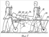 На фиг.5 показана тандемная сцепка двух вышеописанных устройств в сборе. Роль связующего звена в тандеме выполняют носилки (29), которые выполнены либо с вырезом (не показан) в задней части ложа, либо без выреза, причем площадь последнего достаточна для того, чтобы в нее вписалась вертикальная проекция человека, тянущего заднюю половину тандемной сцепки (тележки). Под цифрой (30) показаны поворотные ножки-подставки. На передней тележке внутри грузовой полости выполнена опорная пластина (31), на которую сверху опущена жесткая поворотная пластина (32), которые имеют шарнирно-поворотную связь посредством поворотной оси-штыря (33). На верней части сумки (5) задней тележки жестким образом крепятся соединительные держатели (34). Носилки (29) имеют возможность передними рукоятками фиксированным образом крепиться к поворотной пластине (32), а задними рукоятками – к держателям (34). Кроме того, еще в один вариант комплектации входят два выполненных из прочного материала треугольника жесткости (35), каждый из которых прикреплен к боковым штангам носилок, а также к опорной пластине (31) и, кроме того, посажен на ось колесной пары. Под цифрой (36) показаны фиксирующие лямки.