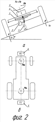 Изобретение поясняется чертежами. На фиг.1,а изображен задний мост транспортного средства (вид сзади), оборудованного дополнительными грузами при его движении по горизонтальной опорной поверхности; фиг.1,б изображено транспортное средство, оборудованное дополнительными грузами, при его движении по горизонтальной опорной поверхности (вид сверху); на фиг.2,а – задний мост транспортного средства (вид сзади), оборудованного дополнительными грузами, при его движении по наклонной опорной поверхности с отключенным механизмом перемещения грузов; на фиг.2,б – транспортное средство (вид сзади), оборудованное дополнительными грузами, при его движении по наклонной опорной поверхности с отключенным механизмом перемещения груза (вид сверху); на фиг.3,а – задний мост транспортного средства (вид сзади), оборудованного дополнительными грузами, при его движении по наклонной опорной поверхности с включенным механизмом перемещения грузов; на фиг.3,б – транспортное средство (вид сверху), оборудованное дополнительными грузами, при его движении по наклонной опорной поверхности с включенным механизмом перемещения грузов.