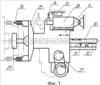 Каждая из размывных головок 9-1 9-n установлена на штоке отдельного гидропривода 23, закрепленного на корпусе размывной камеры 2, и снабжена штыревыми ограничителями 24, имеющими длину, большую, чем наибольшая длина выступающей части форсунки 10. Каждый гидропривод 23 размывных головок 9-1 9-n снабжен датчиком предельно допустимого давления (на чертежах не показан), подключенным к реле времени (на чертежах не показано), которое соединено с устройством (на чертежах не показано) управления вентилем подачи масла в гидропривод 23.