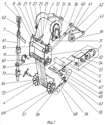 При очередном повороте оправки 4 происходит зажим прокладки 64 между витками ленты. В зависимости от натяга ленты, отслеживаемого указателями 33 по шкалам 34, увеличивают или уменьшают тормозное усилие на барабане 26. Шарнирно подвешенная на взаимно перпендикулярных осях 23 и 24 каретка 2 позволяет ленте самоорентироваться между валками 10 и 11 и поверхностью наматываемой вставки. При этом происходит частичная компенсация непараллельности оси 27 барабана 26 и втулки 71 оправки 4.