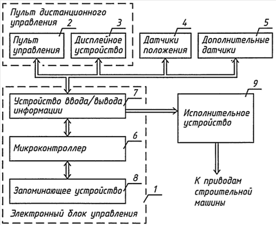 Приводы строительной машины выполнены, преимущественно, в виде гидроцилиндров или гидромоторов, управляемых электрическими пропорциональными или дискретными клапанами. Электронный блок управления 1 соединен с этими приводами через исполнительное устройство 9, выполненное в виде силового электронного блока с дискретными, пропорциональными или широтно-импульсными выходными сигналами.