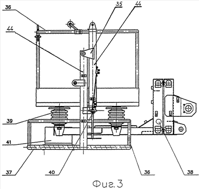 Рабочая платформа 5 подъемника (фиг.3 и 4) трансформируемая, сварной конструкции, выполнена в виде короба, состоящего из двух секций, из которых нижняя имеет днище и боковые стенки, а верхняя – боковые стенки, при этом секции соединены между собой посредством боковых стоек 44 с шарнирным механизмом 35, снабженным фиксаторами 40, с возможностью поворота верхней секции на 180° и складывания ее под нижней секцией.