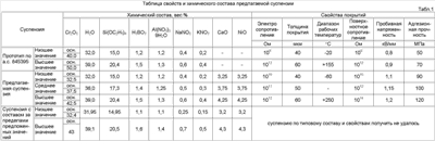 Антистатическое покрытие получают из суспензии, в которой в качестве дисперсионной среды используется раствор, включающий нитраты калия, натрия, алюминия, борную кислоту и гидролизованный тетраэтиловый эфир ортокремниевой кислоты, а в качестве наполнителя – шпинель Cr2O3·СаО и Cr2O3·NiO (размер частиц 3-10 мкм). Введение NiO обеспечивает расширение диапазона отрицательных рабочих температур до требуемых значений (-60°С). Но в то же время наблюдается снижение адгезионной прочности. Для повышения последней характеристики в суспензию вводят оксид кальция. Все составляющие дисперсионной среды легко подвергаются термическому разложению с выделением соответствующих окислов и образованием из них высокоглиноземистых стекол С37-1 (система SiO2(57,6%), Al2O3(29,0%), CaO(7,4%), MgO(8,0%), K2O(2,0%)), соответствующих составу стеклянной части прибора. При этом окислы хрома, кальция и никеля равномерно распределяются в стекловидной матрице. В таблице 1 приведены конкретные составы предлагаемой суспензии и ее свойства. Экспериментально установлено, что введение NiO в виде шпинели Cr2O3·NiO, где NiO составляет от 3,25 до 4,25%, обеспечивает расширение диапазона рабочих температур до -60°С, то есть не наблюдается повышения электросопротивления выше допустимых значений 108-1012 Ом. При меньшем, чем 3,25% NiO значение сопротивления повышается до недопустимой величины 1013-1014 Ом. При содержании NiO более 4,25% существенно ухудшается технологичностью процессов синтеза состава и нанесения покрытий. Введение СаО в виде шпинели Cr2O3·СаО, где СаО составляет от 3,25 до 4,25%, обеспечивает увеличение адгезии нанесенного покрытия к поверхности стекла или керамики, значение адгезии составляет 80-120 МПа. При меньшем, чем 3,25% СаО значение адгезии к поверхности понижается до величины, меньшей 20 МПа. При содержании СаО более 4,25% поверхностное сопротивление возрастает с 108-10 Ом до 1013-14 Ом. В ходе экспериментов установлено, что оптимального результата с точки зрения работы при температурах -60°С и получения высокой адгезии можно достигнуть при соотношении СаО:NiO=1:1. Практически гидролизованный тетраэтиловый эфир ортокремниевой кислоты Si(OC2H5)4 готовят путем добавления к 100 мл свежеперегнанного тетраэтилового эфира при интенсивном перемешивании 45 мл этилового спирта, 15 мл воды и 2-3 капель концентрированной азотной кислоты. В 1 г такого раствора содержится 0,186-0,190 г двуокиси кремния. Покрытие после термообработки при температуре имеет следующий состав, вес.%: SiO2 – 5,3-8,4 В2О3 – 1,3-1,9 Al2O3 – 0,3-0,4 Na2O – 0,3-0,5 K2O – 0,2-0,4 Cr2O3 – 80,3-82,3 NiO – 3,7-4,25 СаО – 3,7-4,25. Покрытие с оптимальной толщиной 40-60 мкм наносится на поверхность прибора шликерным методом, величина электросопротивления данного покрытия составляет 108-1011 Ом. Толщина покрытия, а, следовательно, и величина сопротивления может регулироваться в требуемых пределах за счет вязкости состава и скорости нанесения. Величина пробивной напряженности покрытия (прочность покрытия), обеспечивающая стабильность работы прибора, должна быть не менее 1,0 кВ/мм. В табл.1 представлены свойства составов предлагаемой суспензии. Предложенный состав был опробован при изготовлении стеклянных микроканальных пластин для приборов ночного видения и рентгеновских трубок с высокой разрешающей способностью. При этом покрытие легко наносится на широко используемое высокоглиноземистое стекло С37-1; металличес