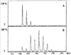 На Фиг.1 представлены фрагменты масс-спектров, демонстрирующих изотопное распределение в брадикинине до (А) и после обмена (Б). Из сравнения спектров видно, что обмен произошел и имеет место включение от одного до двух атомов 18О.