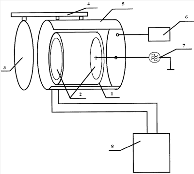 ВЧЕ плазменная установка (фиг.1) содержит плексигласовый барабан (1), ВЧ-электроды (2), колпак вакуумной камеры (3), консоль для открытия крышки вакуумной камеры (4), вакуумную камеру (5), систему подачи и регулировки плазмообразующего газа (6), ВЧ-генератор (7), вакуумный откачной пост (8).