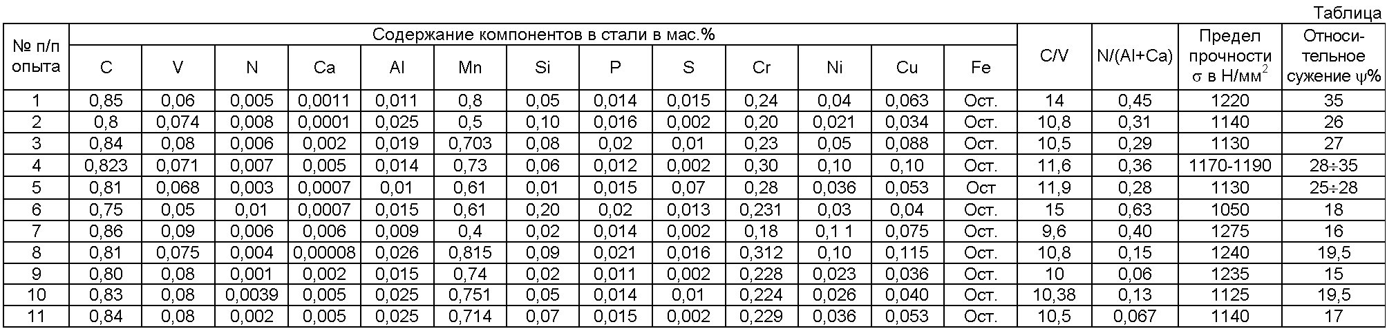 при этом отношении содержания углерода к содержанию ванадия составляет не менее 10,5, а отношение содержания азота к суммарному содержанию алюминия и кальция составляет не менее 0,13. Все выше указанные пределы содержания компонентов в предлагаемой стали получены в результате обработки опытных данных. Сущность заявляемого технического решения заключается в оптимизации содержания всех ее компонентов, в результате этого достигается требуемый интервал прочностных свойств стали при сохранении высоких пластических характеристик, что особенно важно при производстве высокоуглеродистого стабилизированного арматурного периодического профиля (арматурной проволоки). При этом отношение содержания углерода (С) к содержанию ванадия (V) и отношение содержания азота (N) к суммарному содержанию алюминия (Al) и кальция (Са) должны быть не более 10,5 и 0,13 соответственно. При вводе кальция в металл он испаряется и в виде пузырьков всплывает на поверхность жидкого металла. За счет низкой активности кислорода кальций реагирует с серой и выделяется в виде сульфидов кальция. Также кальций реагирует с алюминием и продуктами первичного раскисления с образованием жидких алюминатов кальция, что улучшает условия разливаемости металла. Таким образом, кальций позволяет уменьшить количество включений глинозема и сульфидов марганца. Введение в металл кальция позволяет изменить морфологию образующихся неметаллических включений, переводя ее из «опасной» в более благоприятную, глобулярную, и очистить границы зерен от карбонитридов. Помимо снижения загрязненности металла неметаллическими включениями введение в сталь кальция позволяет обеспечить ее глубокое раскисление и увеличить усвоение легирующих компонентов и получить требуемые прочностные свойства. Алюминий способствует получению мелкодисперсной структуры металла, а следовательно позволяет обеспечить требуемое значение предела прочности. Хром и ванадий относятся к элементам, которые в значительной степени упрочняют матрицу стали, за счет атомов внедрения и избыточных карбидов, выделяющихся в металле после прокатки, поэтому сталь с предлагаемым содержанием хрома и ванадия имеет повышенное упрочнение, что позволяет обеспечить предел прочности ( Относительно высокое содержание марганца в стали позволяет получать требуемый предел прочности, а ограничение по содержанию никеля и меди позволяет получать относительное сужение, т.к. никель и медь снижают пластичные свойства. При отношении содержания углерода к содержанию ванадия – C/V менее 10,5 образуется недостаточное количество избыточных карбидов, а при отношении содержания азота к суммарному содержанию алюминия и кальция – N/(Al+Ca) менее 0,13, приводит к повышенному содержанию неметаллических включений, в результате чего полученная готовая продукция из такой стали не соответствует требуемому интервалу предела прочности и уровню пластических свойств относительного сужения. Ограничение по содержанию кремния до 0,1% позволяет снизить содержание хрупких силикатов, а также при следующей холодной деформации избежать резкого снижения пластических свойств (в связи с тем, что более высокое содержание кремния препятствует движению дислокации). За счет эвтектоидного состава и микролегирования хромом, алюминием и ванадием обеспечиваетс