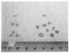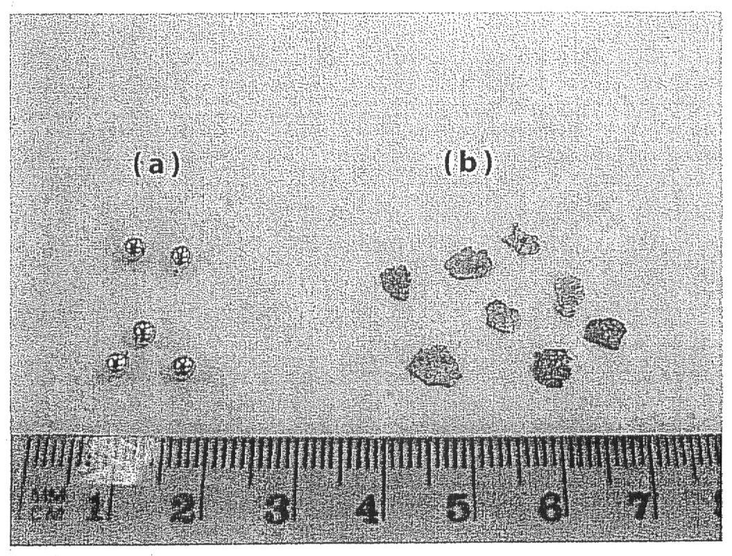 Степень деформируемости при ударе о стальную пластину с расстояния 20 м дроби, полученной из сплава олово-висмут с 22% предокисленного ферровольфрама, как усиливающей частицы; (а) дробь до выстрела, (b) дробь после выстрела.