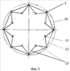 С открытого торца каркаса 5 каждое ребро 11 во внешнем ряду жестко соединено другим своим концом с соответствующими концами смежных ребер 11 посредством соединительных элементов 12, конец каждого ребра 11 внутреннего ряда жестко соединен с соответствующими концами двух близлежащих ребер 11 внешнего ряда посредством перемычек 13.