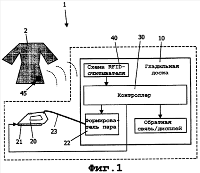 В целях передачи информации от изделия 2 к контроллеру 30 используется система RFID, где схема 40 RFID-считывателя размещена в гладильной доске 10 и где RFID-метка 45 размещена в изделии 2, которое должно быть поглажено.