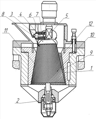 В отличие от известных решений, в предлагаемом устройстве на рабочих поверхностях корпуса 1 и ротора 3 выполнены винтовые рифления, соответственно, 9 и 10. Направления наклона линий винтовых рифлений 9 и 10 идентичны. Сопряжение рабочих поверхностей корпуса 1 и ротора 3 осуществляется по смежной образующей 11. Несопряженные части рабочих поверхностей корпуса 1 и ротора 3 образуют серповидную в поперечном и клиновидную во фронтальном сечениях рабочую полость 12.
