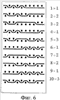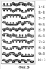 На фиг.5 показаны контуры основной нити для ткацкого рисунка согласно фиг.4. Числа справа от каждого контура обозначают номер основной нити и номер контура этой нити. Например, основные нити 1, 4, 6 и 9 имеют контуры номер 1, смещенные в шахматном порядке. Данный ткацкий рисунок содержит 3 разных контура основной нити, расположенных в последовательности 1, 2, 2, 1, 3, которая повторяется дважды в одном раппорте рисунка. Каждая основная нить соответствует колонке на фиг.4. Например, основная нить 1 имеет рисунок, показанный в первой колонке на фиг.4, а именно основная нить 1 проходит под уточными нитями 1-3, над уточной нитью 4, под уточной нитью 5, над уточными нитями 6 и 7, под уточной нитью 8, над уточной нитью 9 и под уточной нитью 10. Соответственно, в колонке 1 на фиг.4 наличие цифры 1 в квадратиках, соответствующих уточным нитям 4, 6, 7 и 9, означает, что основная нить 1 образуют петли, проходя над этими уточными нитями. Пустые квадратики на фиг.4 означают, что основная нить проходит под уточными нитями.