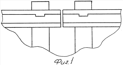 На фиг.1 схематично изображены концы двух стыкуемых рельсов с пазами, вид сверху. На фиг.2 схематично изображена внешняя накладка с выступами-зубьями.