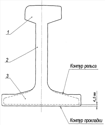 Выполнение подошвы прокладки, выступающей за контур подошвы рельса, не ограниченный стыковыми накладками, на 4-5 мм, позволяет дополнительно снизить вероятность образования токопроводящих мостиков между рельсами.