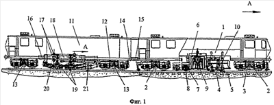 Машина для подбивки и стабилизации железнодорожного пути (фиг.1, 2 и 3) содержит машинную раму 1, опирающуюся ходовыми тележками 2 с ходовым приводом 3 на рельсовый путь 4 со шпалами 5 с возможностью непрерывного рабочего перемещения в направлении А, установленную между ходовыми тележками 2 дополнительную раму 6 с колесной парой 7 и приводом 8 циклического перемещения ее в направлении А из одной рабочей позиции для подбивки шпал в другую рабочую позицию и несущую шпалоподбивочный агрегат 9 для подбивки шпал 5 и расположенный перед шпалоподбивочным агрегатом 9, подъемно-рихтовочный агрегат 10. Непосредственно за машиной рамой 1 установлено стабилизирующее транспортное средство 11 с рамой 12, опирающейся на ходовые тележки 13, которая своим передним концом 14 соединена с машинной рамой 1 сцепным устройством 15. Между ходовыми тележками 13 на раме 12 стабилизирующего транспортного средства 11 на продольных направляющих 16 рамы 12 посредством роликовых опор 17 установлена каретка 18, несущая стабилизирующий агрегат 19 с приводом 20 динамического воздействия на рельсовый путь 4, с возможностью перемещения стабилизирующего агрегата в продольном направлении А относительно рамы 12 стабилизирующего транспортного средства 11 приводом, например гидроцилиндром 21, для сохранения постоянной продолжительности операций стабилизации рельсового пути 4.
