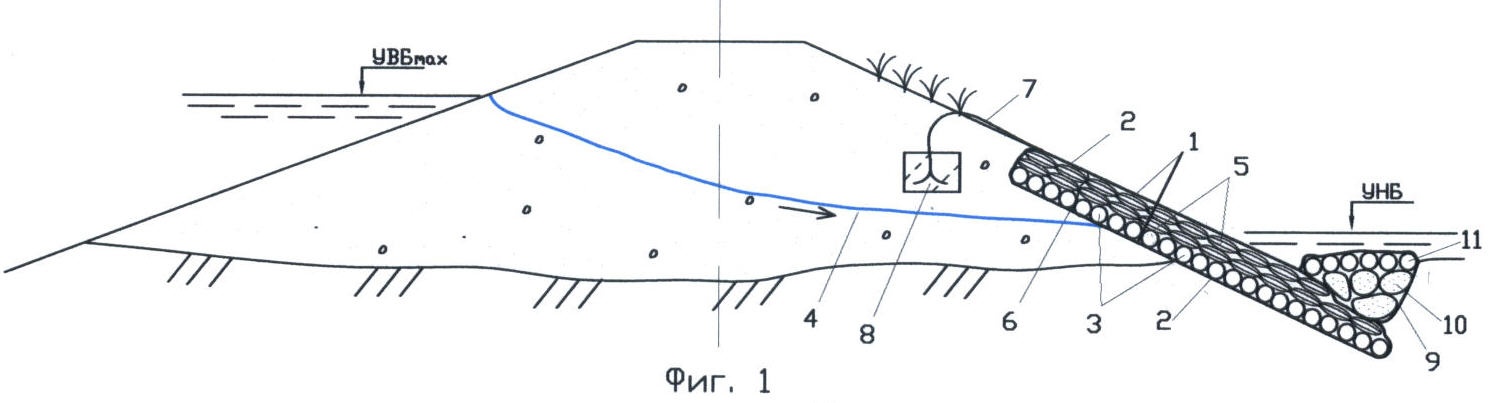 Наслонный дренаж биопозитивной конструкции состоит из гибких тюфяков 1, выполненных из сетчатых оболочек 2 и дренирующего заполнителя, который сложен из рядов легких фашин. Причем нижние ряды фашин 3 уложены нормально к направлению фильтрационного потока 4, а верхние ряды фашин 5 – по его направлению; местами тюфяки 1 прошиты металлической проволокой 6. Гибкие тюфяки 1 сверху прикреплены с помощью арматурной проволоки 7 к анкерам 8. Снизу у подошвы низового откоса гибкие тюфяки 1 сверху нагружены более тяжелыми тюфяками 9, в сетчатых оболочках которых, снизу сложены несколько рядов мешков 10 из местного и растительного грунтов, а сверху – плотные ряды легких фашин 11.