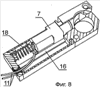 Предпочтительно возвратная пружина 18 представляет собой пружину сжатия и расположена между электродвигателем 7 и торцевой крышкой 4, хотя вместо торцевой крышки 4 можно предусмотреть внутри корпуса специальные упоры для опирания пружины 18. Альтернативно, возвратная пружина 18 может быть выполнена в виде пружины растяжения, которая располагается между электродвигателем 7 и, например, головкой 2. Также возможны и другие варианты выполнения и расположения пружины, которые будут очевидны для специалиста.