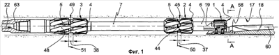 Кроме того, отклоняющее клиновое устройство 18 содержит скрепленный с ней при помощи сварки радиально-упорный элемент 58 для установки с эксцентриситетом 59 зарезного фрезера-райбера 1 относительно центральной продольной оси 60 отклоняющей части 2 отклоняющего клинового устройства 18 в плоскости симметрии 61 наклонной поверхности в виде желоба 62, выполненной в отклоняющей части отклоняющего клинового устройства 18, при этом поз.63 – переводник для соединения фрезерного инструмента с колонной бурильных труб или с валом заторможенного шпинделя героторного гидравлического двигателя, показано на фиг.1, 2.