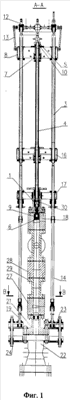 Пакерующий шток 5 подводят к пакерующему элементу 6 и соединяют с ним накидной гайкой 30. Далее проводят демонтаж вилки (не показано), монтируют устройство на переводную катушку 21 трубной головки и крепят их фланцевые соединения.