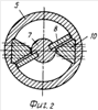 На внутренней поверхности цилиндрического корпуса 5 по всей длине жестко закреплены и расположены параллельно оси вращения и равномерно две перегородки 10 с впускными и выпускными каналами. Перегородки 10 в поперечном сечении представляют собой равнобедренную трапецию. Впускные и выпускные каналы перегородок 10 расположены соосно впускным и выпускным каналам цилиндрического корпуса 5, то есть они взаимосвязаны, и в них установлены клапаны (не показано).