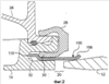 На фиг.1 первая часть 12 кольца представлена схематично с одного из концов, в то время как вторая часть 14 кольца представлена закрепленной на корпусе турбины 26 при помощи кольцевой детали в виде зажима 28. С этой целью вторая часть 14 кольца имеет кольцевую выемку 32 с краями 34, 36, которые простираются в осевом направлении. Одна из губок 30 детали в виде зажима 28 опирается на радиально наружный край 34 выемки 32. Между зажимной губкой 30 и радиально внутренним краем 36 кольцевой выемки 32 находится кольцевое пространство 38.