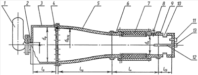 где Fперф – площадь перфорации диафрагмы, Fф – площадь сечения форкамеры, Fок – площадь выпускных окон, Fм – площадь сечения мерного газохода, а расстояние от среза сопла газогенератора до диафрагмы lд=1,5÷2dм, длина переходного участка газохода lпер=2,5÷3dм, диаметр форкамеры dф=1,7÷2dм, где dм – диаметр мерного участка газохода.