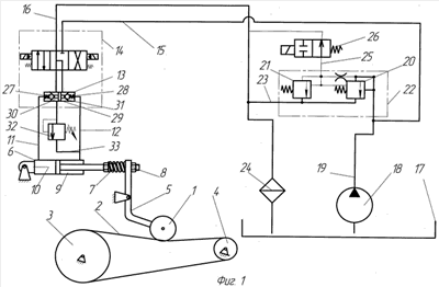 При подаче электрического сигнала с пульта управления к электрогидравлическому распределителю 14 и электромагнитному клапану 26 золотник электрогидравлического распределителя выводится из нейтрального положения, например, в позицию «Натяжное устройство молотилки включено», а электромагнитный клапан 26 запирает слив рабочей жидкости в бак 17 через линию управления 25 переливного клапана 20 и последний отключает слив рабочей жидкости в бак 17. Рабочая жидкость под давлением от насоса 18 поступает одновременно к электрогидравлическим распределителям гидросистемы управления гидроприводами рабочих органов комбайна (условно не показаны) и по гидролиниям 19, 15 – к электрогидравлическому распределителю 14 к его гидроуправляемому запорному устройству 13, в предклапанную полость 30, запорного клапана 27 и предохранительного клапана 32, воздействует на поршенек 29, последний, перемещаясь, открывает запорный клапан 28 и соединяет штоковую полость 9 исполнительного гидроцилиндра 6 и предохранительный клапан 32 с баком 17 через гидролини 33, 12, открытый запорный клапан 28, предклапанную полость 31, полости электрогидравлического распределителя 14 гидролинию 16 и фильтр 24. После открытия запорного клапана 28 и соединения штоковой полости 9 исполнительного гидроцилиндра 6 с баком 18 рабочая жидкость от насоса 18 одновременно поступает к предохранительному клапану 32, настроенному на меньшее давление чем предохранительный клапан 21 гидросистемы, открывает запорный клапан 27 и через гидролинию 11 поступает в плунжерную полость 10 исполнительного гидроцилиндра 6, перемещая его шток. Шток исполнительного гидроцилиндра 6 через пружину сжатия 7, воздействуя на шарнирно установленный рычаг 5, перемещает натяжной ролик 1 к ремню 2 ременной передачи, соединяющему шкив двигателя 4 со шкивом 3 привода молотилки, и производит включение молотилки и натяжение ремня 2 до определенного момента. Усилие натяжения ремня 2 контролируется настраиваемым давлением предохранительного клапана 32, при достижении которого предохранительный клапан 32 срабатывает, перепуская рабочую жидкость в бак 17 через гидролинии 33, 12, открытый запорный клапан 28, предклапанную полость 31, полости электрогидравлического распределителя 14, гидролинию 16 и фильтр 24. В этот момент перемещение штока исполнительного гидроцилиндра 6 и связанного с ним через пружину сжатия 7 и шарнирно установленный рычаг 5 ролика 1 прекращается, исключая перенатяжение ремня 2 ременной передачи.