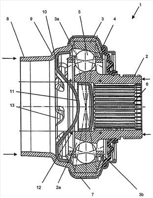 Следовательно, посредством профиля, материала и/или формы крышки 10 можно заданным образом установить как максимальное расстояние, проходимое внутренней обоймой 2 при ее перемещении, так и восприятие крышкой 10 усилий. Так, крышка 10 может воспринимать без проникновения внутренней обоймы 2 в полый участок 8 вала осевое усилие, например вызванное дорожно-транспортным происшествием, составляющее примерно от 150 до 200 кН.